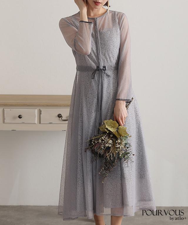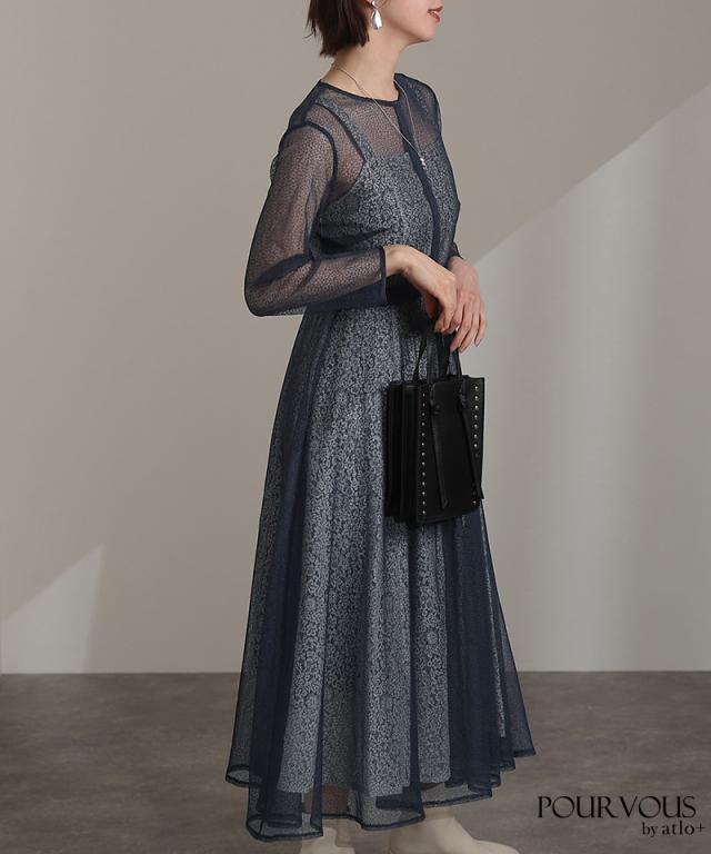 幾何学模様のチュールからチラッと覗く小花柄が可愛いワンピース。