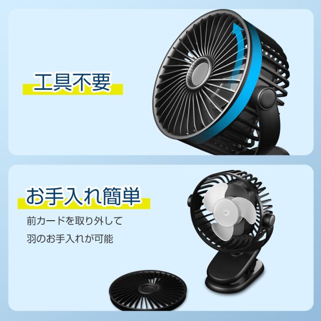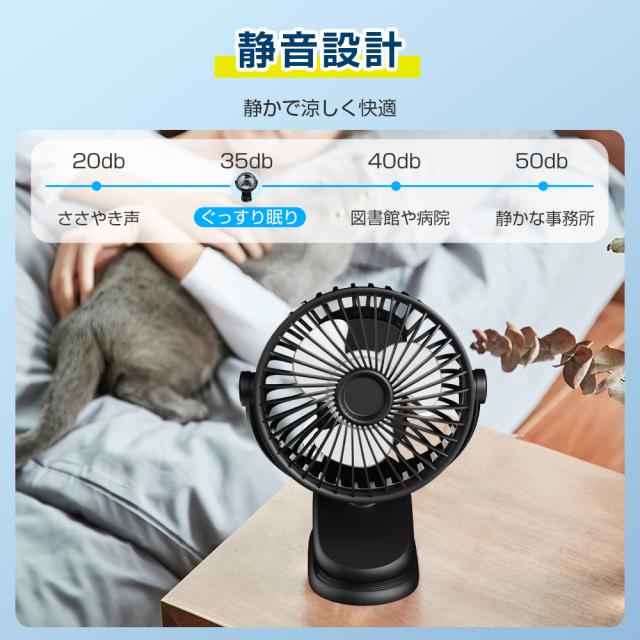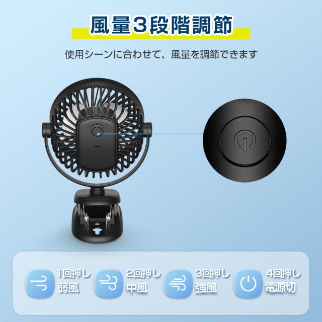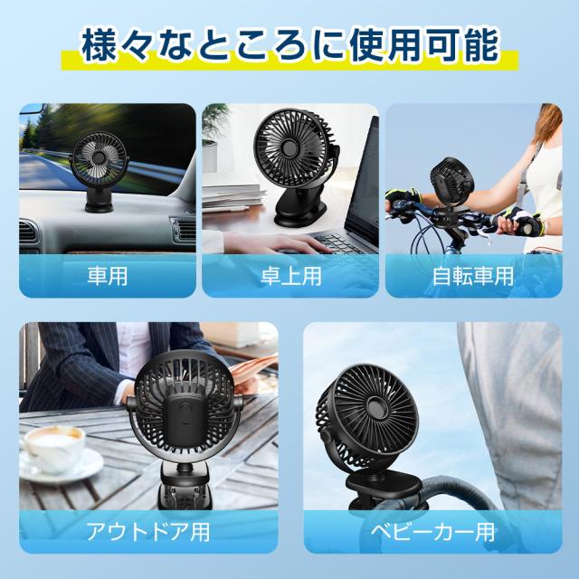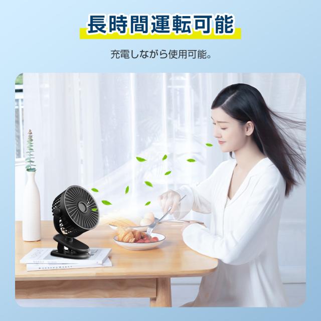 - コンパクトで軽量なのに、風量がしっかりしていて驚きました。 手持ちの小型より大きく、かつ邪魔にならないサイズ。 音も静かで、仕事中も気になりません。 車内の換気用に使う予定なので、風量は3段階で満足です。クリップはしっかりしています。