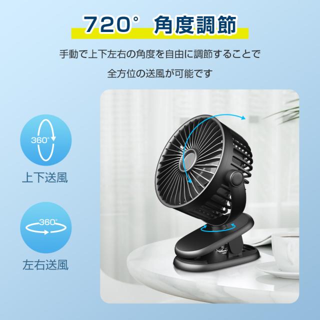 【720°回転&3段階風量調整】送風モードが3段階(弱風、中風、強風)調整可能です。360度上下左右に回転可能で好みに合わせて角度調整して様々な角度から気持ち良い涼しい風が吹きます。
