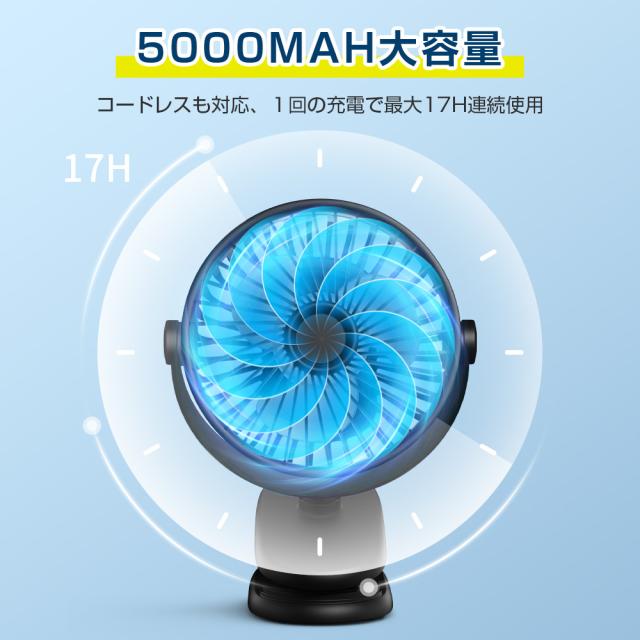 【USB充電式&5000mAh大容量バッテリー】USBケーブルとバッテリー2式給電、パソコン、モバイルバッテリー、パソコンなど等のUSBポートに差し込むだけ簡単にご利用できるUSB扇風機です。5000mAh大容量バッテリー内蔵で長時間連続使用可能です。アウトドアだけでなく停電などの時にも活躍します。