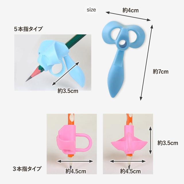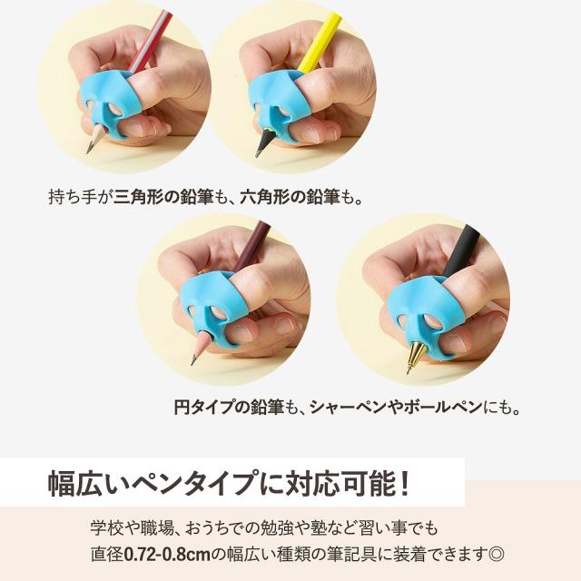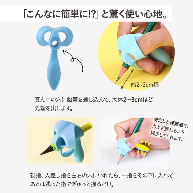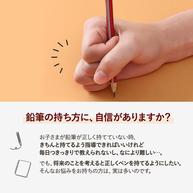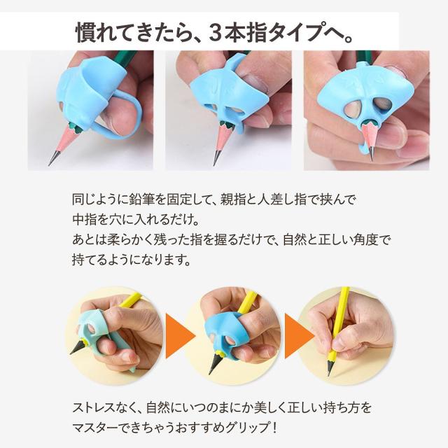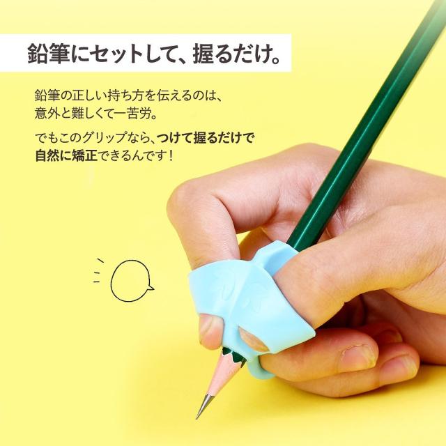 | 商品の説明 | ペンの持ち方、姿勢が気になるお子さまや、社会人として字を美しく書きたい方にも。 ペンを持つすべての方へ、自信と正しい持ち方が得られるいま大人気のおすすめグリップ! 鉛筆の正しい持ち方を伝えるのは、意外と難しくて一苦労。 でもこのグリップなら、つけて握るだけで自然に矯正できるんです! まだ鉛筆に慣れていないお子さまでも、ぎゅっと握るだけで正しくもてる5本指タイプと 一歩先に進めるようになったらおすすめしたい3本指タイプの2種類をセットでお届け。 学校や職場、おうちでの勉強や塾など習い事でも直径0.72-0.8cmの幅広い種類の筆記具に装着できます◎ 同じように鉛筆を固定して、親指と人差し指で挟んで中指を穴に入れるだけ。 あとは柔らかく残った指を握るだけで、自然と正しい角度で持てるようになります。 ストレスなく自然にいつのまにか美しく正しい持ち方をマスターできちゃうおすすめグリップ! |