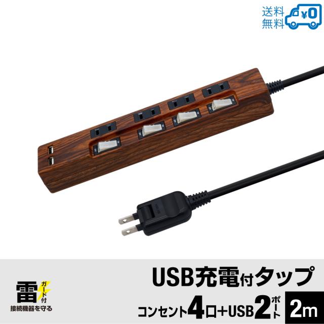 【送料無料】STYLED 木目調 USB充電付電源タップ コンセント×4口 USB×2ポート 合計2.4A 電源コード2m 18ヵ月保証 雷ガード 個別スイッチ スイングプラグ シャッター付コンセント OAタップ 延長コード ダークブラウン ウォルナット調 STP4UA2CG-2
