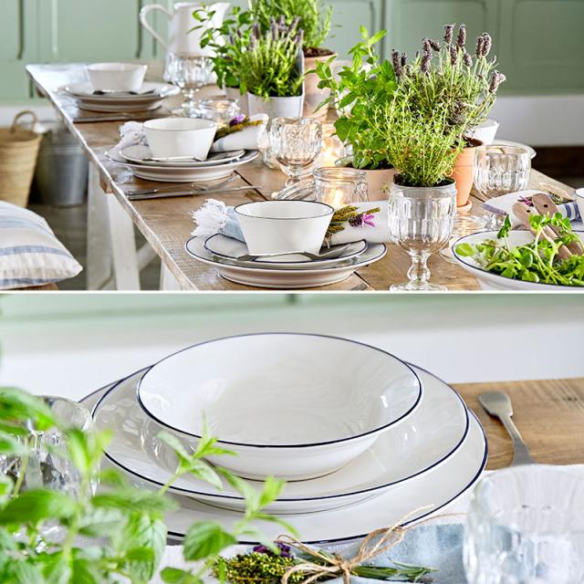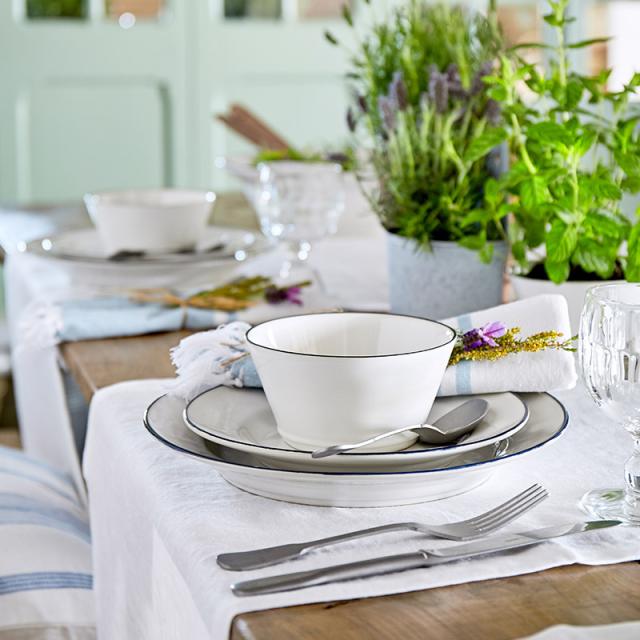 艶のある白とネイビーのデザインはまるでホーロー食器のようですが、手作業ならではの色や形の“ブレ”が温もりを感じさせてくれます。コーディネート次第でカジュアルにもエレガントにもなり、毎日の食卓をヨーロッパのカフェのような雰囲気に演出します。