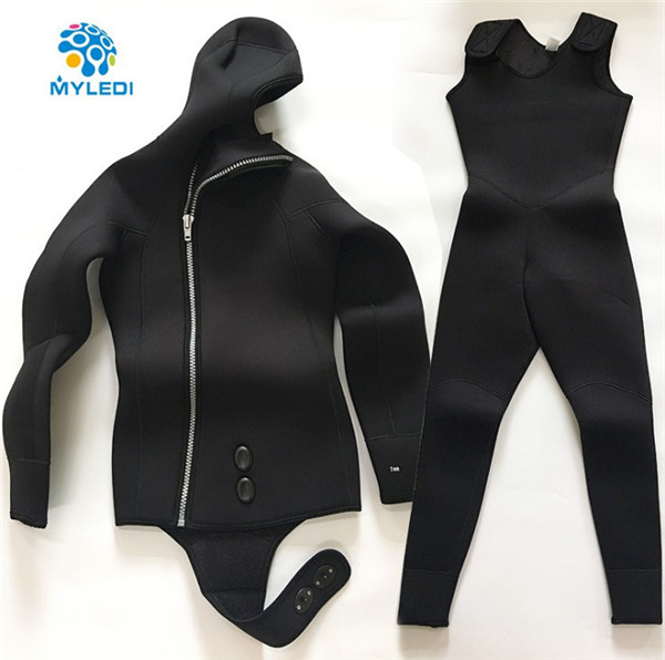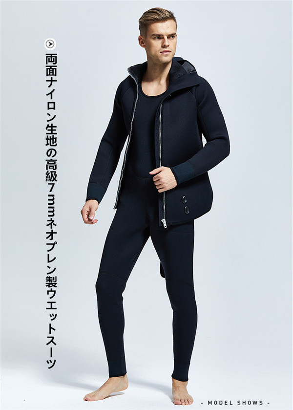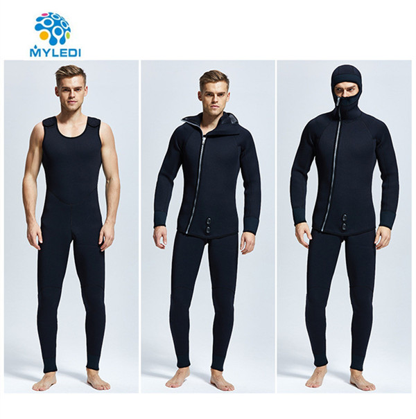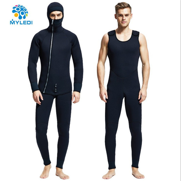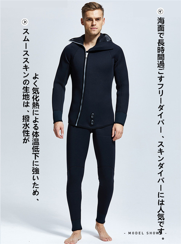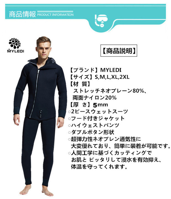 【商品説明】【ブランド】MYLEDI【サイズ】S,M,L,XL,2XL【材 質】ストレッチネオプレーン80%、 両面ナイロン20%【厚 さ】 5mm○2ピースウェットスーツ○フード付きジャケット○ハイウェストパンツ○ダブルボタン形状○超弾力性ネオプレン 通気性に大変優れており、簡単に装着が可能です。○人間工学に基づくカッティングでお肌と ピッタリして浸水を有効抑え、体温を守ってくれます。☆スムーススキンの生地は、撥水性がよく気化熱による体温低下に強いため、海面で長時間過ごすフリーダイバー、スキンダイバーには人気です。【保管について】☆海から上がったら、なるべく早めに洗う。☆熱いお湯はNG、必ず水かぬるま湯で洗う。☆乾燥は直射日光を避け、細いハンガーは使用しない。しっかりと乾燥したら、なるべく早めに表面へ戻す。