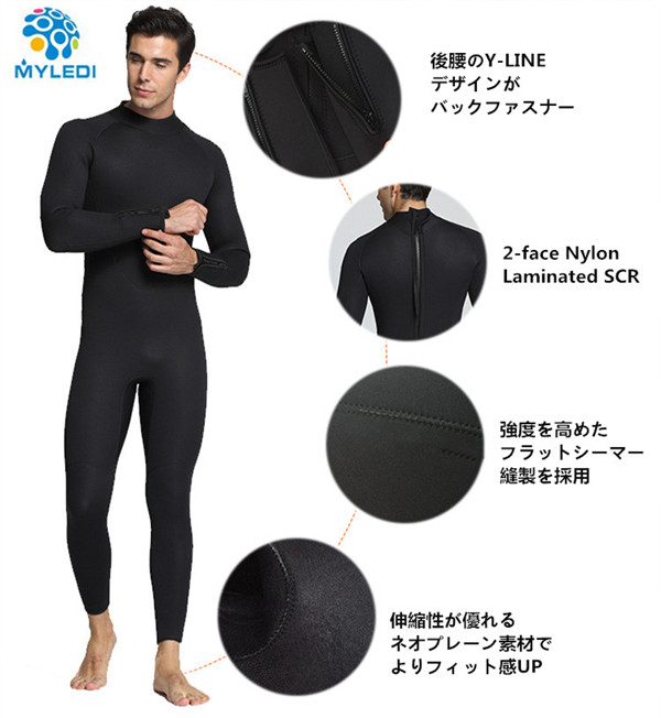【商品説明】ウェットスーツ メンズ レディース ダイビング フルスーツ サーフィン バックジップ 5MMストレッチネオプレンを使用、 運動性、保温性に優れて、幅広く利用できるオールシーズンワンピースです。人間工学に基づくカッティングでお肌と ピッタリして浸水を有効抑え、体温を守ってくれます。後腰のY-LINEデザインがバックファスナー の引っ張りを軽減、運動中大きな動きを保証します。膝にハードテック ジャージを採用、関節部を守ってくれます。ダイビング、シュノーケル、サーフィン、カヤック、サップフィッシング、パドリング、ジェットスキー、海上作業などに幅広く適用できます。【ブランド】MYLEDI【サイズ】S,M,L,XL,2XL【材 質】ストレッチネオプレーン80%、 両面ナイロン20%【厚 さ】 5mm【保管について】海から上がったら、なるべく早めに洗う。熱いお湯はNG、必ず水かぬるま湯で洗う。乾燥は直射日光を避け、細いハンガーは使用しない。しっかりと乾燥したら、なるべく早めに表面へ戻す。