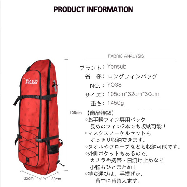 【商品特徴】◇お手軽フィン専用バッグ長めのフィン4本でも収納可能!◇サイズ:105×32×30cm ◇恒温システム設計のフロントポケット。◇両サイドはスピアガンなどを固定ベルト付き◇タオルやグローブ、マスクスノーケルセットもすっきり収納できます。。◇大容量 多機能 乾湿分離設計◇太めのショルダーストラップで肩も痛くなりにくい!!