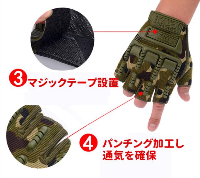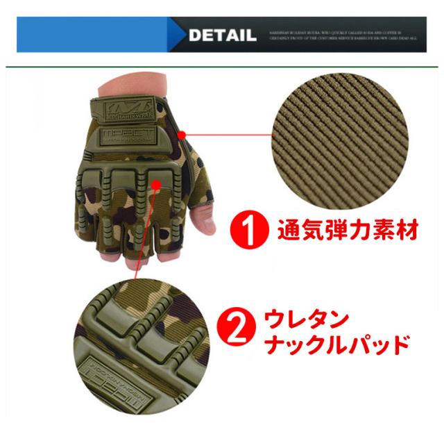 [商品特徴]◎握りやすいラバーナックルプロテクターを装備した、 夏の快適性と操作性を重視したフィンガーレスグローブ。◎運動性を高める立体裁断◎通気性の良いメッシュ素材を使用◎耐衝撃性に優れたナックルパッド装備◎手首の固定は調整可能なマジックテープ式◎多くの滑り止めを採用することでグリップ力向上[商品スペック]【素材/材質】Chamude/Spandex/Polyester/Neoprene【プロテクター】knuckleハード【サイズ】M,L,XL【重 量】約155g[写真注意]※画像はイメージです。