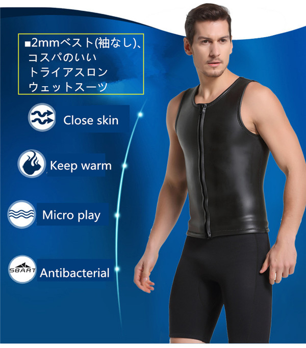 【商品説明】ウェットスーツ メンズ ダイビング ベスト サーフィン 2MMストレッチネオプレンを使用、 運動性、保温性に優れて、幅広く利用できるオールシーズンワンピースです。人間工学に基づくカッティングでお肌と ピッタリして浸水を有効抑え、体温を守ってくれます。。ダイビング、シュノーケル、サーフィン、カヤック、サップフィッシング、パドリング、ジェットスキー、海上作業などに幅広く適用できます。【材質】ストレッチネオプレーン【保管について】海から上がったら、なるべく早めに洗う。熱いお湯はNG、必ず水かぬるま湯で洗う。乾燥は直射日光を避け、細いハンガーは使用しない。しっかりと乾燥したら、なるべく早めに表面へ戻す。