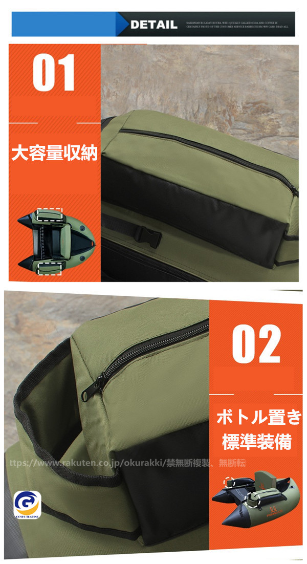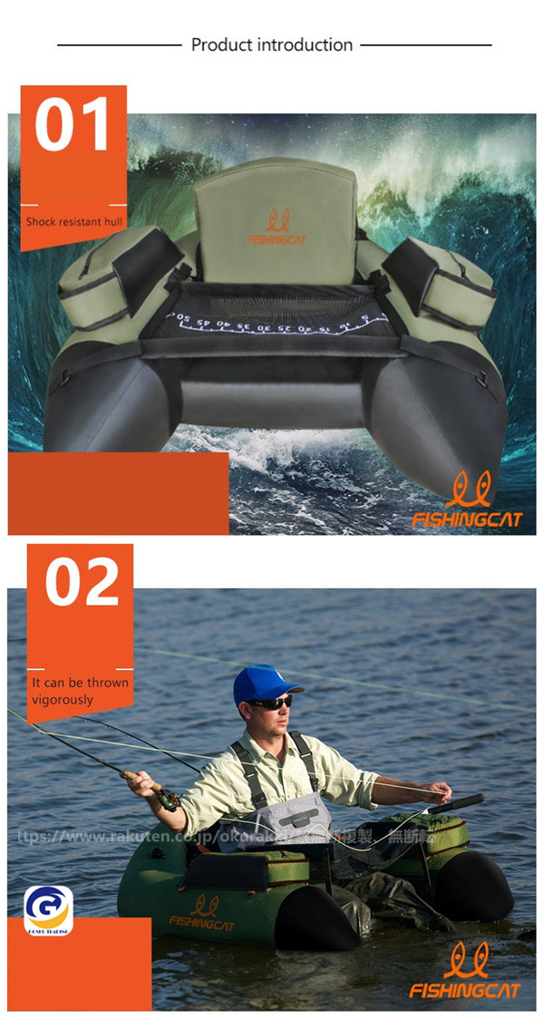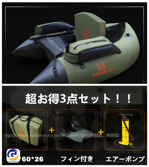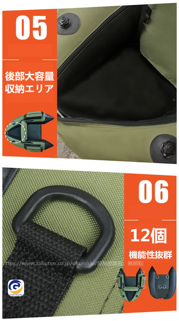 [商品スペック]●全長:約1400mm●全幅:約1200mm●収納サイズ:26×48×60cm●材質:本体部PVC+帆布、ポリエステル+底部PVE●船体重量:約4kg●定員最大積載量:一人(160kg)●生地厚:0.9mm●付属品:収納バッグ、フィン、エアーポンプ[商品説明]●ボート釣りでは出来ない魚との近距離対決、フィッシングフローター。●フローターの弱点であった「積載量」を向上させた「V型」のオール付きモデル。後方へV型に突き出たチューブが囲いとなり、収納できるスペースを確保。●チューブの先端は反り上がっていることで、抵抗も少なく、飛沫なども入りにくいデザインです。●低重心設計で、抜群の安定性を実現。●劣化に対して最も強い「熱溶接」で、耐久性に優れています。●収納バッグで収納抜群、移動楽々。[ご注意]●商品の欠陥や初期不良など以外、交換/返品は受付対応できません。●空気漏れの確認は使用する都度、毎回行ってください。●流れの無い場所(止水)にてご使用ください。●安全確保のため、単独でのご使用は避けてください。●ご使用の際は、ウエーダー/ベルト/フィン/ライフベストを着用ください。