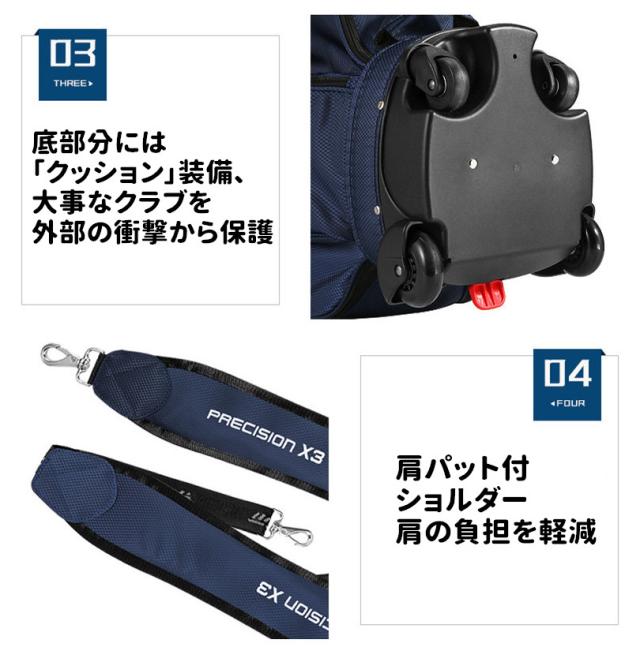 【商品特徴】◎4輪キャスター付きで移動も楽に行うことができ、普段電車なども公共交通機関での移動の多い都心ゴルファーやちょっとしたゴルフ旅行にも最適なバッグ!◎航空機を利用してのゴルフに最適!キャスター付きで移動も楽々!◎伸縮自在フードのトップ部分にティー差しと小物入れが付ていて便利◎背面部のシューズインポケット標準装備◎防撥水性の高い生地を使用、急な悪天候からクラブを保護◎便利な傘ホルダー/多数小物収納ポケットなど、使い勝手に優れた機能が満載◎ケースの底部分には「クッション」装備、大事なクラブを外部の衝撃から保護。【 商品スペック】■素 材 :優れた防水耐摩ナイロン■サイズ: 9.0型 約92*40*29cm■収納可能クラブ数:13-14フルセット収納可 ■口 枠: 6分割 23*19cm■重 さ: 約5.0kg■カラー:NAVY RED BLACK GRAY ORANGE■対 象:メンズ 男性用 レディース 女性用 ユニセックス 男女兼用■原産国:中国※こちらの商品は特別ご奉仕品となりますので返品交換不可です。※フードは背袋やサイドポケットに収納されています。万が一見当たらない場合は全てのポケットをご確認ください。