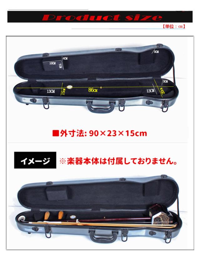 【商品特徴】◎ボディーに軽量かつ堅牢の二胡ケース。◎軽量&ショルダー付で持ち運びらくらく!◎柔らかいフォームのパッドのデザインで.衝突から楽器を保護◎ケース内には、楽器のパーツをしっかり収納可能◎使い勝手と耐久性にこだわった高品質二胡ケース【商品スペック】■防水&防湿&耐久性カラスファイバ製■外寸法: 90×23×15cm■内寸法: 86×20cm■重量: 約2.90kg■付属品:ショルダータイプストラップ付属■備 考:手提げ/ショルダー※画像はイメージです。楽器本体は付属しておりません。