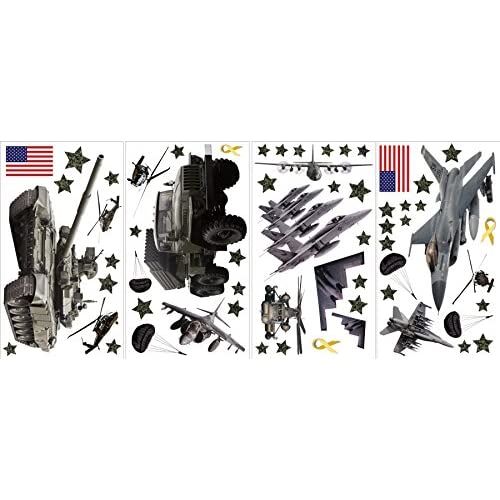 戦車からジェット機、ヘリコプター、パラシュート、旗まで、ミリタリーウォールキットは愛国的なテーマをお子様の部屋にもたらします。 62種類の軍隊のデカールで、あなたの小さな兵士は、新しくてエキサイティングなシーンを作成するために配置と再配置を気に入るはずです。 4枚の9.75"x17.25"シートで提供され、約50 "x 35"に組み立てられ、壁に安全です。