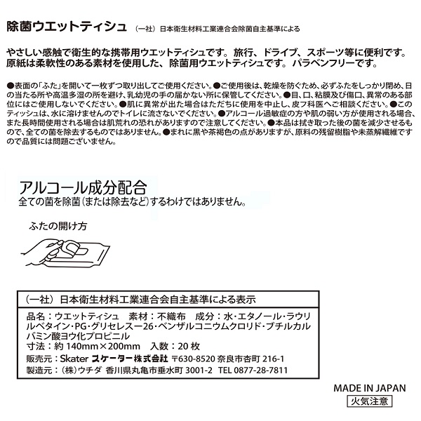 スケーター 除菌ウェットティッシュ 除菌シート アルコール成分配合 20枚入り プラレール WTS2 Skater