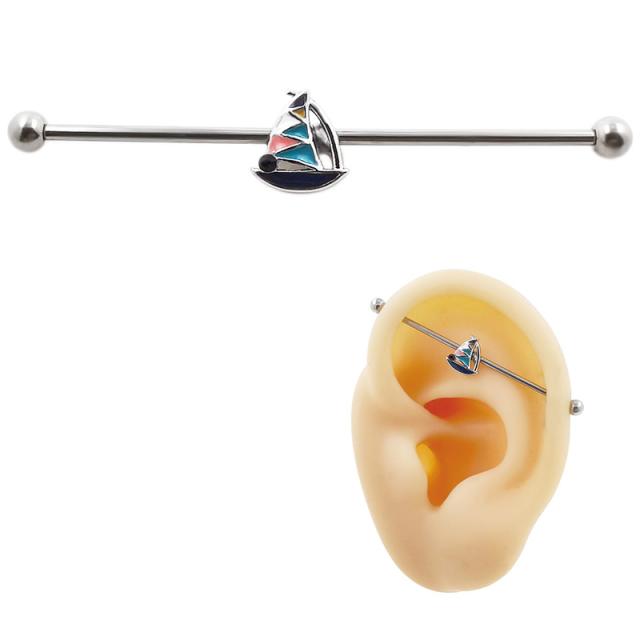 カラフルなエナメルコーティングしたボートを16ゲージの長いロングタイプのストレートバーベルにセットしたインダストリアル用ボディピアス。爽やかなマリンな雰囲気を醸し出す船のパーツがおしゃれなメガバーベル型ボディーピアス。
