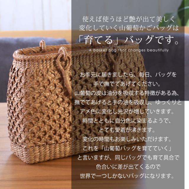 | 商品説明 | 天然山葡萄の蔓(つる)のバッグかごです。山に自生する山葡萄の蔓を贅沢に使用し、熟練の職人さんが手作りで編み上げています。 天然素材の丈夫で美しい一生もののバッグです。 使えば使うほど艶が出て美しく変化していく山葡萄かごバッグは「育てる」バッグです。 必要なものがしっかり収まる程よいサイズ感。自然素材の可愛いシルエットで、マチも十分にあるので普段使いに大活躍のファッションアイテムです。 季節を問わず通年使え、着物にもカジュアルにも似合います。 付属の内布は柿渋染めです。天然素材ならではの温かみのある色合いで、防腐、防虫効果に優れています。柿渋染めは使い込むほどに深みのある色へ変化していきます。 やさしい風合いが山葡萄バックに相性がよろしいです。 お手元に届きましたら、毎日、バッグを手で撫でてあげてください。 山葡萄の皮は油分を吸収する特徴がある為、撫でてあげると手の油を吸収し、ゆっくりとアメ色に変化し光沢が増していきます。 時間とともに自分色に染まるようで、とても愛着が沸きます。変化の時間もお楽しみいただけます。 これを「山葡萄バッグを育てていく」と言いますが、同じバッグでも育て具合で色合いに差が出てくるので世界で一つしかないバッグになります。 <山葡萄バッグができるまで> ・蔓の採取 山葡萄の蔓から取った皮を使い、熟練の職人が丹精込めてひとつひとつ作っています。 人里離れた標高1,000m以上の山奥で昔から寒冷地に自生する植物です。 蔓と言っても太さ10cm以上にもなります。 その蔓を剥ぎ取り乾燥させて、かごバッグの材料となるようサイズを整えていきます。 ・編む 職人が作った木型に合わせて、バッグの底部から編んでいきます。 網目が均等にするには指先の力が強くないと綺麗に仕上げることができません。 最後に細かい毛羽を丁寧に取り除き、かごバッグのできあがりです。 ・技術 丁寧に編み上げられた山葡萄かご編みは、熟練の職人が何日もかけて作り上げていくので大量生産ができず稀少性が高いです。 その為、市場に出回る数も限られています。 ・内布を取り付け ナチュラルでおしゃれな柿渋染めの内布が付いています。天然の柿渋原液を使用し染め上げています。 優しい風合いが山葡萄バックに相性がよろしいです。 内布は縫い付けて固定されていますので、安定した収納ができバッグの中身も安心です。 ・柿渋染めの理由 柿渋には防虫、防カビ、防腐、防臭、消臭などの効果があります。 山葡萄の蔓は正常にご使用、保管していただけば、カビが生えることはありませんが、湿気が多いところで保管すると表面にカビが発生する場合があります。 それを予防目的も兼ねてコストを掛けてでも、山葡萄バッグに柿渋染めの内布を取り付けています。 <山葡萄かごバッグの選び方> 初めて憧れの山葡萄バッグを持つ方は、定番の「網代編み」がとても人気です。 2個目、3個目を購入する方は「六角花編み」や「サイズ違い」をお選びいただく場合が多いです。 山葡萄チャームやお財布もございます。 職人が丁寧に編み上げた籠バッグは世代を超え永く愛することができます。 年月を重ねるほど深みを増す色合いと艶を楽しめる山葡萄シリーズは、母の日や誕生日プレゼントなどの贈り物としても大変喜ばれる逸品です。 長年、時間を共にしたバッグはなんとも言えない艶に輝き、しなやかさも合わせ持ち、手放せないものになる一生ものです。 編み方がおしゃれな山葡萄バッグは花かごとしてもインテリアやディスプレイのアクセントとしてもお使いいただけます。 自然素材をお楽しみください 天然素材を使用し、すべて手編みで手作り品の為、サイズ・重量ともに若干の個体差が生じます。 自然素材特有のささくれ、割れ、色ムラが生じる場合がございます。 ささくれや色ムラ等は、使い込むうちに自然と馴染み、風合いよくなめらかになっていきます。 天然素材を使用している為、予めご理解、ご了承いただき自然の風合いをお楽しみいただければ幸甚です。 |