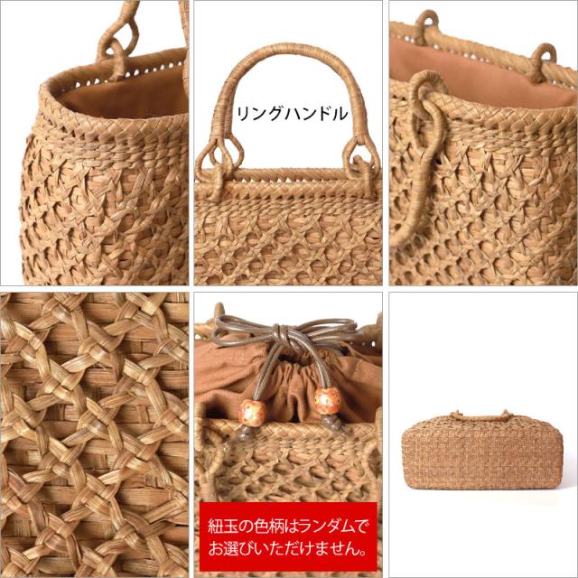 | 仕様 | 二重六ツ目編み リングハンドル 柿渋染め内布(巾着タイプ 内ポケット付き) 取り扱い説明書 保証書付き |