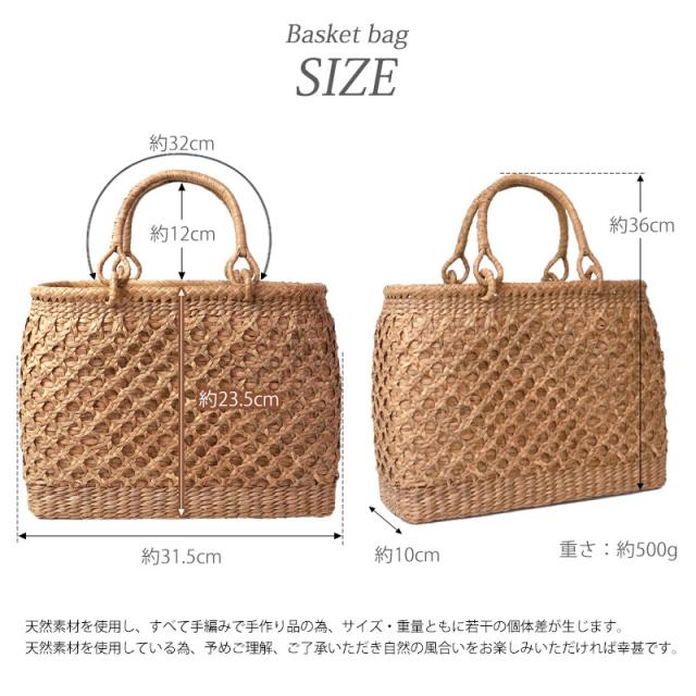 | ご購入に関するご注意 | ・天然素材を使用し、すべて手編みで手作り品の為、サイズ・重量ともに若干の個体差が生じます。 また、自然素材特有のささくれ、蔓の歪み、割れ、色ムラが生じる場合がございます。 ささくれや色ムラ等は、使い込むうちに自然と馴染み、風合いよくなめらかになっていきます。 ・内布もまた天然素材での染めのため、多少色味に違いが生じる場合がございます。 天然素材を使用している為、予めご理解、ご了承いただき自然の風合いをお楽しみいただければ幸甚です。 ・モニター・ディスプレイによっても写り方が変ります。 予めご了承くださいませ。 |