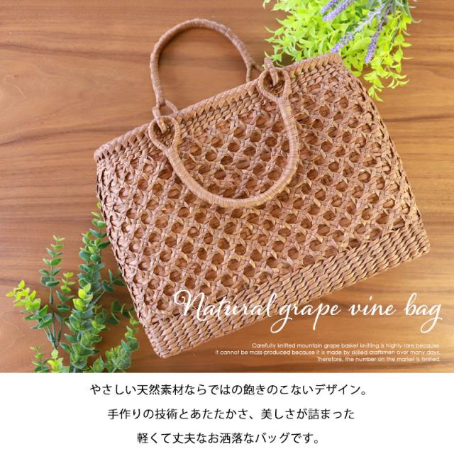 天然山葡萄の蔓(つる)のバッグかごです。山に自生する山葡萄の蔓を贅沢に使用し、熟練の職人さんが手作りで編み上げています。