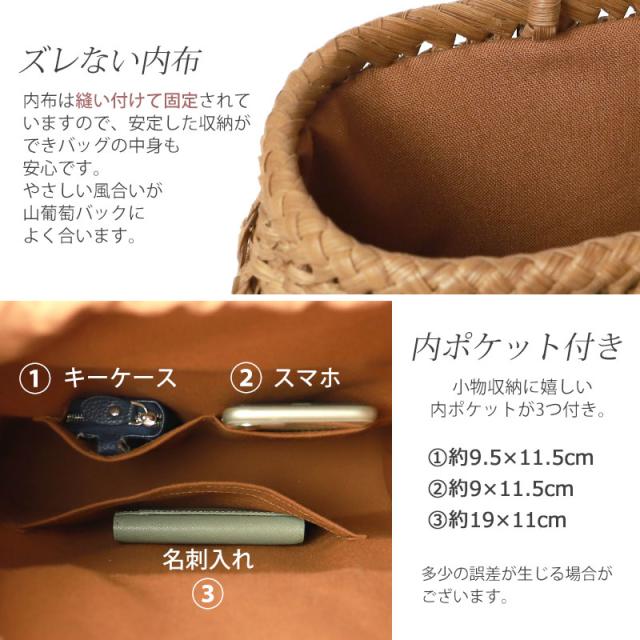 | 素材 | 鞄本体:天然山葡萄蔓 内布:綿100%(柿渋染め) |