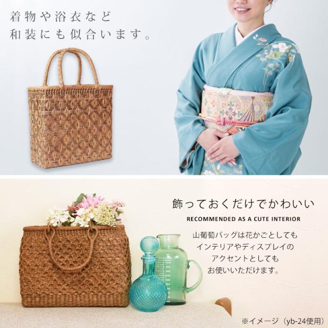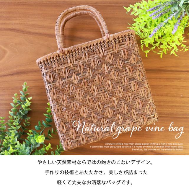 天然山葡萄の蔓(つる)のバッグかごです。山に自生する山葡萄の蔓を贅沢に使用し、熟練の職人さんが手作りで編み上げています。天然素材の丈夫で美しい一生もののバッグです。使えば使うほど艶が出て美しく変化していく山葡萄かごバッグは「育てる」バッグです。必要なものがしっかり収まる程よいサイズ感。自然素材の可愛いシルエットで、マチも十分にあるので普段使いに大活躍のファッションアイテムです。季節を問わず通年使え、着物にもカジュアルにも似合います。山葡萄 かごバッグ 1年保証付き 内布付き 山ぶどう やまぶどう 蔓 天然素材 カゴバッグ 籠バッグ バスケット レディース 大人 おしゃれ 綺麗 連続枡網代編み 固定ハンドル 手提げ ハンドメイド 手作り 母の日