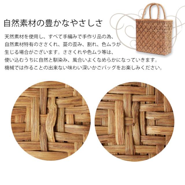 | ご購入に関するご注意 | ・天然素材を使用し、すべて手編みで手作り品の為、サイズ・重量ともに若干の個体差が生じます。 また、自然素材特有のささくれ、蔓の歪み、割れ、色ムラが生じる場合がございます。 ささくれや色ムラ等は、使い込むうちに自然と馴染み、風合いよくなめらかになっていきます。 ・内布もまた天然素材での染めのため、多少色味に違いが生じる場合がございます。 天然素材を使用している為、予めご理解、ご了承いただき自然の風合いをお楽しみいただければ幸甚です。 ・モニター・ディスプレイによっても写り方が変ります。 予めご了承くださいませ。 |