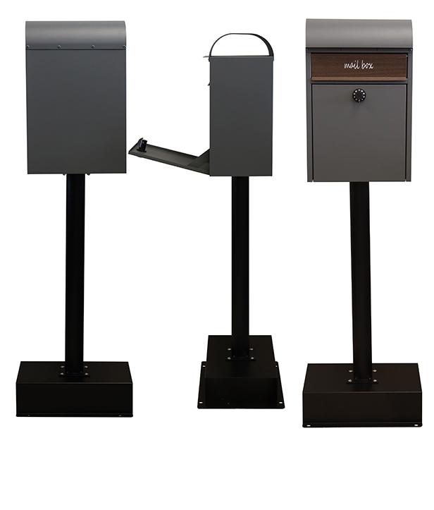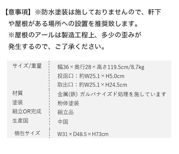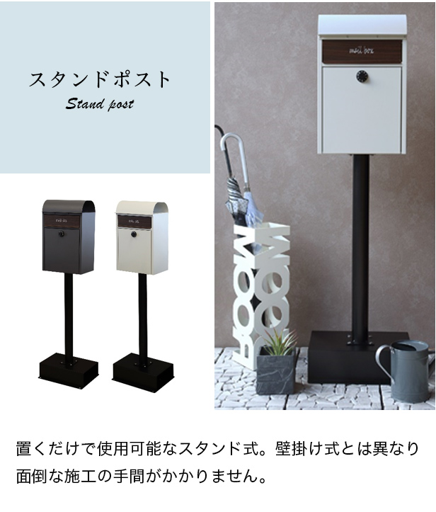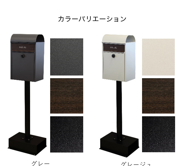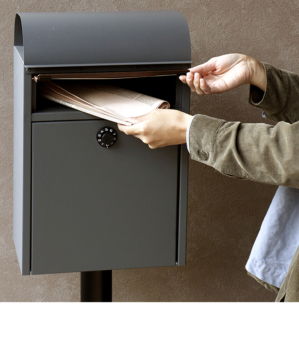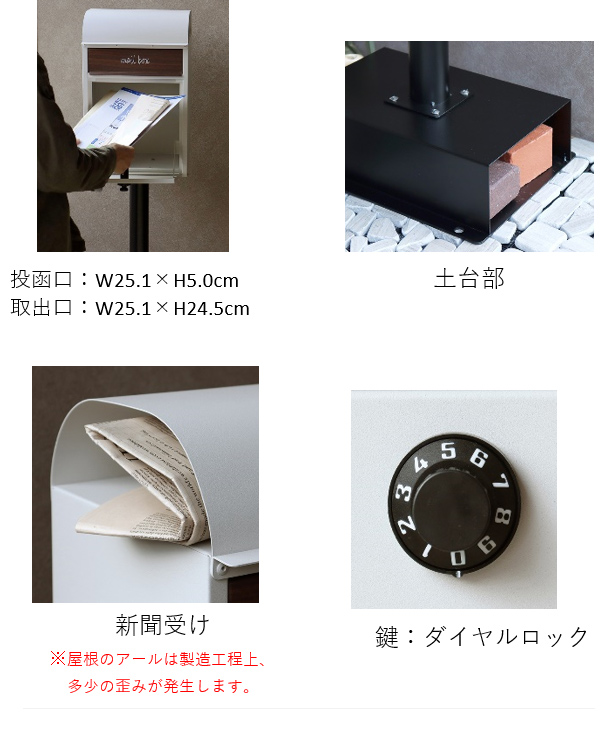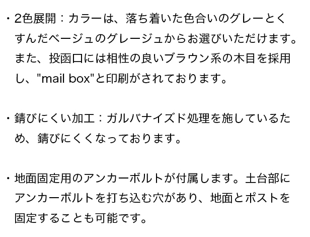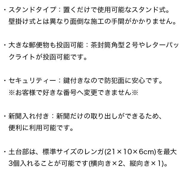 スタンドタイプ:置くだけで使用可能なスタンド式。壁掛け式とは異なり面倒な施工の手間がかかりません。大きな郵便物も投函可能:茶封筒角型2号やレターパックライトが投函可能です。セキュリティー:鍵付きなので防犯面に安心です※お客様で好きな番号へ変更できません。新聞入れ付き:新聞だけの取り出しができるため、便利に利用可能です。土台部は、標準サイズのレンガ(21×10×6cm)を最大3個入れることが可能です(横向き×2、縦向き×1)。2色展開:カラーは、落ち着いた色合いのグレーとくすんだベージュのグレージュからお選びいただけます。また、投函口には相性の良いブラウン系の木目を採用し、"mail box"と印刷がされております。錆びにくい加工:ガルバナイズド処理を施しているため、錆びにくくなっております。地面固定用のアンカーボルトが付属します。土台部にアンカーボルトを打ち込む穴があり、地面とポストを固定することも可能です。※防水塗装は施しておりませんので、軒下や屋根がある場所への設置を推奨致します。※屋根のアールは製造工程上、多少の歪みが発生するので、ご了承ください。