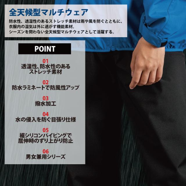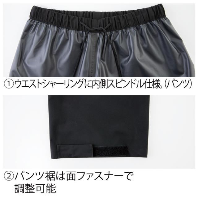 ◇機能:撥水加工。ウエストシャーリングの内側スピンドル仕様。パンツ裾は面ファスナーで調整可能。長靴の上からでもかぶせる事ができる裾巾。