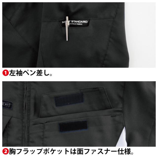 ◇機能:長財布もスッポリ入る深めのファスナーポケット・左胸ポケット脇ペン差し付き・胸フラップポケットは面ファスナー仕様・左袖ペン差し