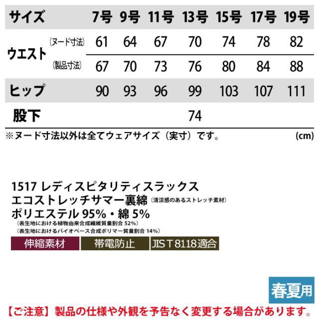 ジーベック XEBEC 作業服 春夏用 1517 レディスピタリティスラックス 17号-19号 作業着