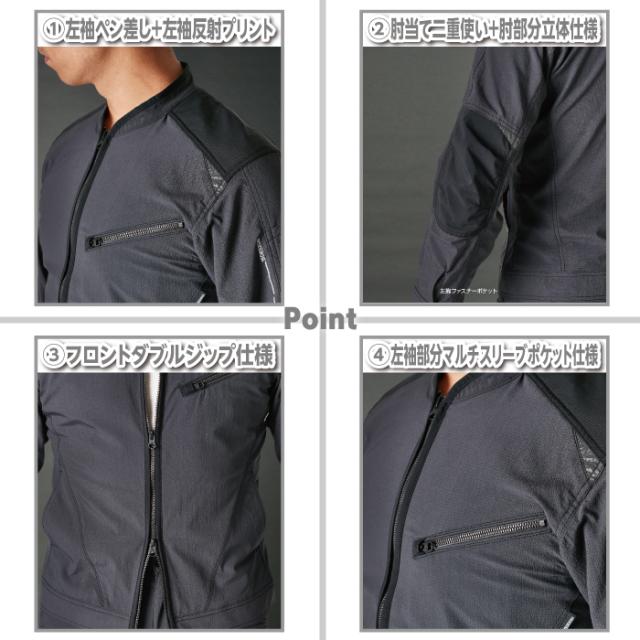 ◇ 機能:超軽量・4Dストレッチ・超強度・帯電防止素材・安心の日本製素材使用・形態安定性・反射機能・耐久撥水・左袖ペン差し+左袖反射プリント・肘当て二重使い+肘部分立体仕様・フロントダブルジップ・左胸ファスナーポケット