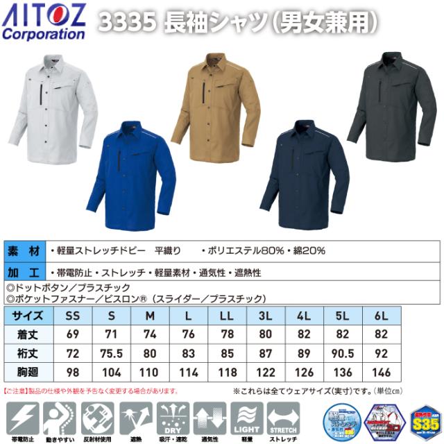アイトス 作業服 作業着 Aitoz 春夏用 AZ-3335 長袖シャツ(男女兼用) 3L