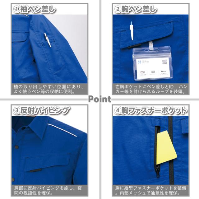 ◇機能:反射パイピング・ポケット内メッシュ・胸ファスナーポケット・袖ペン差し・胸ペン差し・脇下メッシュ・背部反射パイピング・サイドポケット