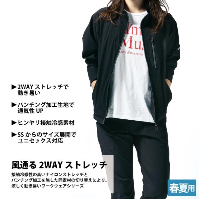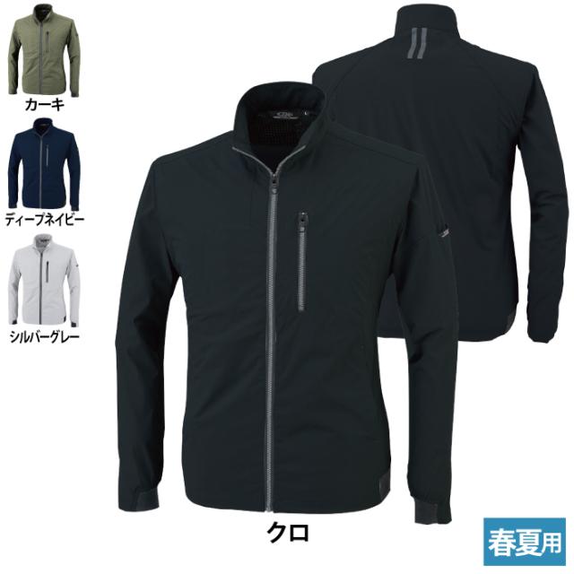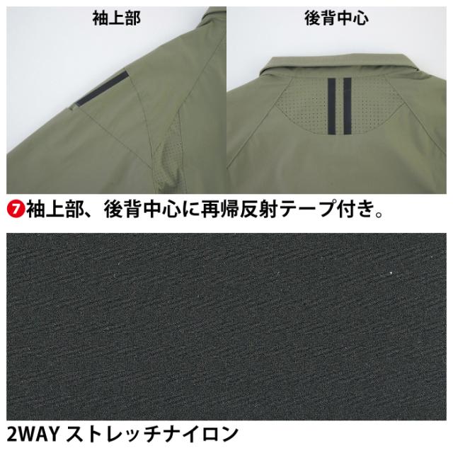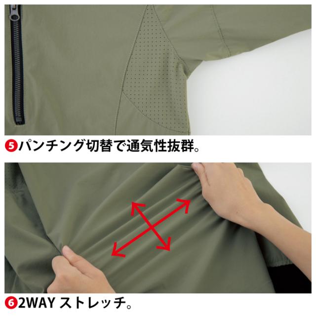 ◇機能:動きやすい2WAYストレッチ。左胸ファスナーポケット。左袖ペン差し。袖脇リブ仕様でタイトなシルエット。袖口リブ仕様。パンチング切替で通気性抜群。袖上部・後背中中心の再帰反射テープ付き。