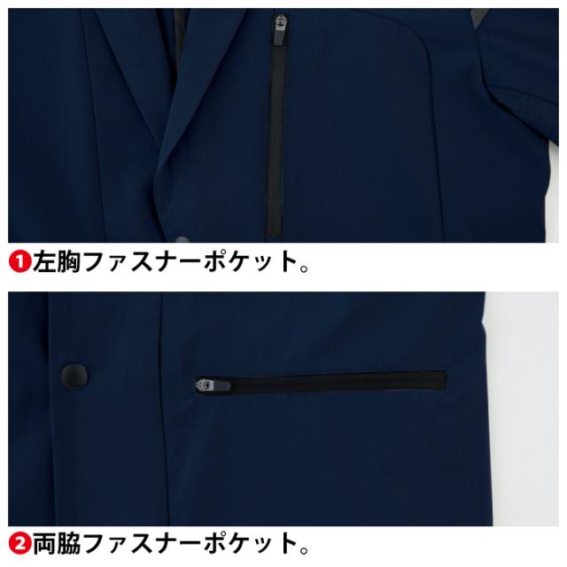 ◇機能:左胸ファスナーポケット。両脇ファスナーポケット。左袖はペン差し・再帰反射テープ付き。袖下パンチング切替で通気性抜群。2WAYストレッチ。