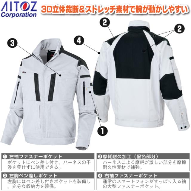 ◇機能:右袖ファスナーポケット・左袖ファスナーポケット・摩耗耐久加工(配色部分)・ムービンカット・左胸ペン差しポケット・反射パイピング・両胸V字ポケット・エストファスナーポケット