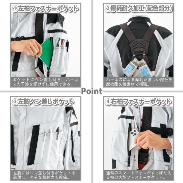 ◇機能:右袖ファスナーポケット・左袖ファスナーポケット・摩耗耐久加工(配色部分)・ムービンカット・左胸ペン差しポケット・反射パイピング・両胸V字ポケット・エストファスナーポケット