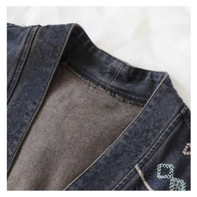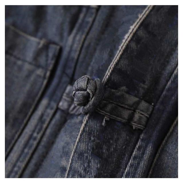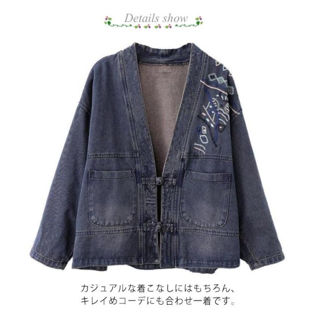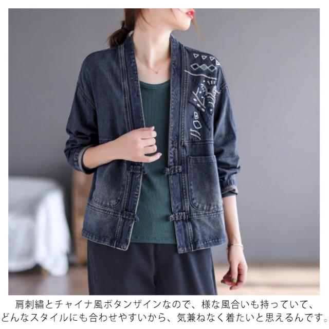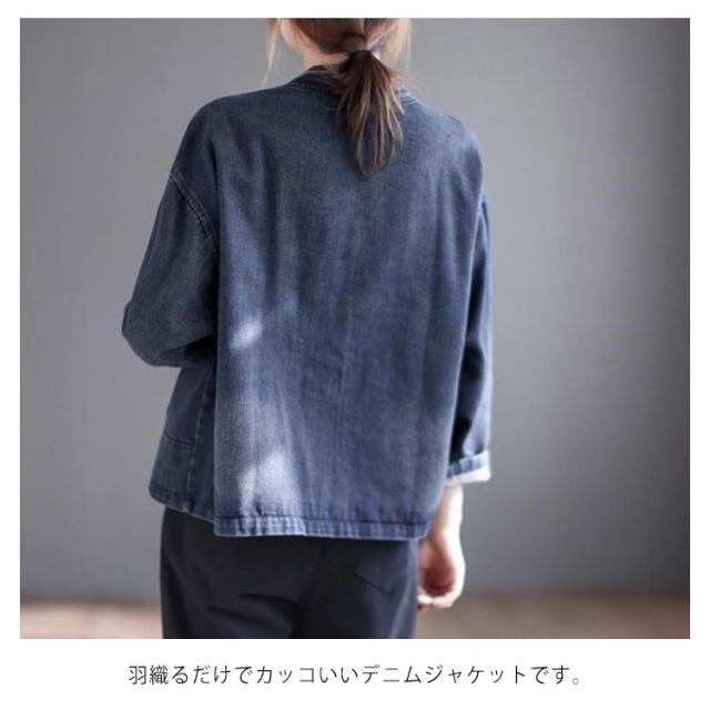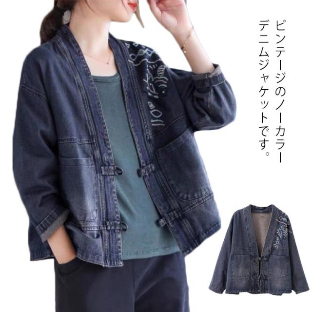 肩刺? チャイナ風ボタン ジャケット レディース デニム ノーカラージャケット 長袖 ショートジャケット ライトアウター 羽織り カジュアルジャケット 前開き 襟なし シンプル ゆったり 着?せ 春 夏 秋 大きいサイズ M-5XL ビンテージ 送料無料
