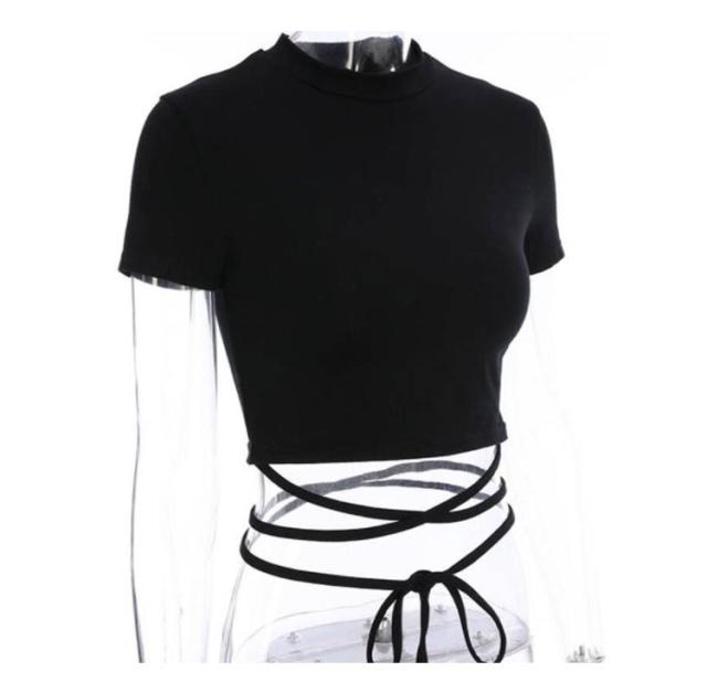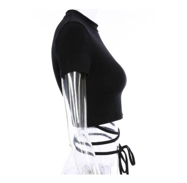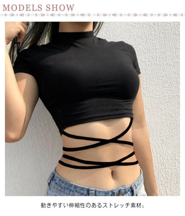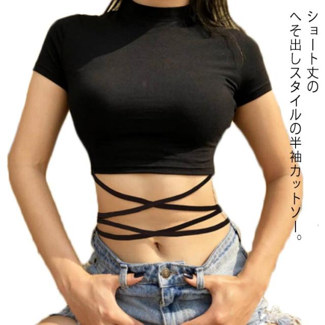 へそ出し カットソー レディース 半袖 tシャツ ダンス衣装 トップス 無地 ヒップホップ 黒 ショート丈 編み上げ タイト おしゃれ ジャズ k-pop 韓国 ファッション ハイネック 着痩せ ガールズ ジュニア 送料無料
