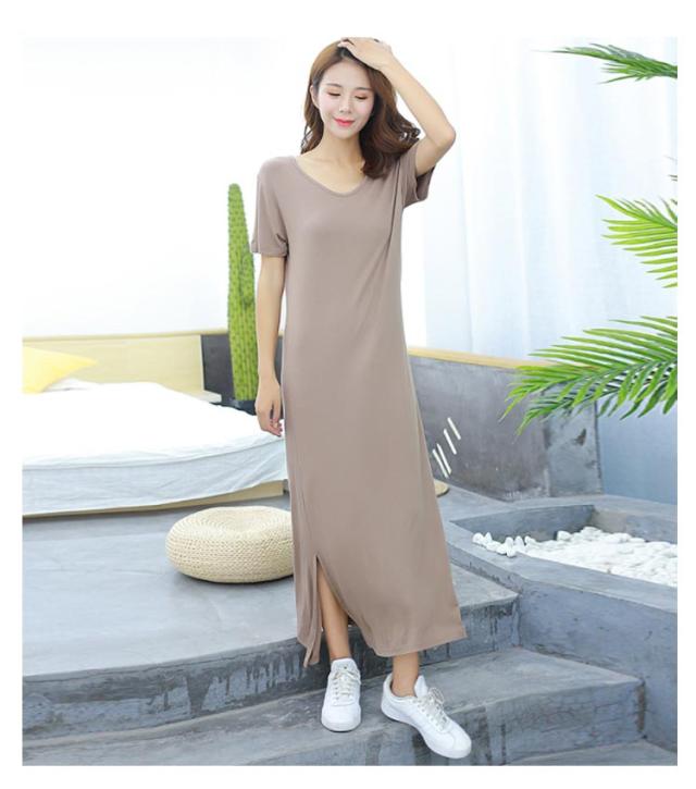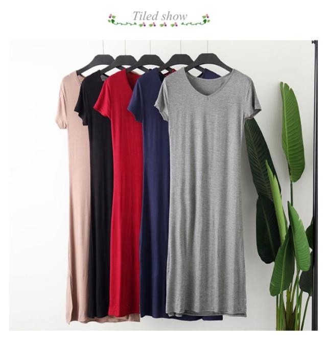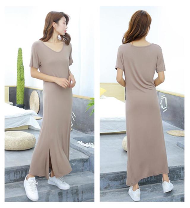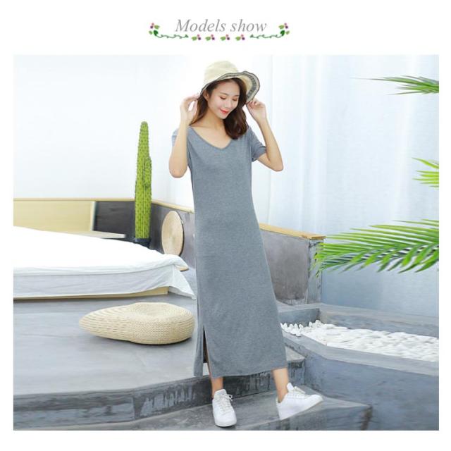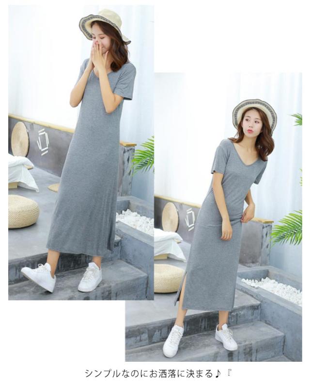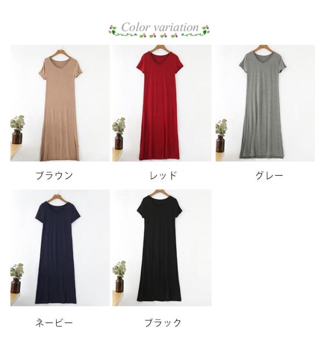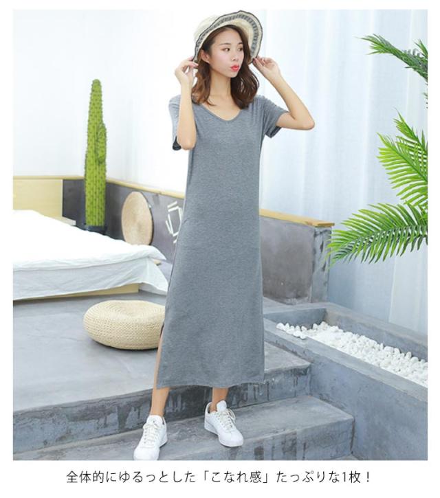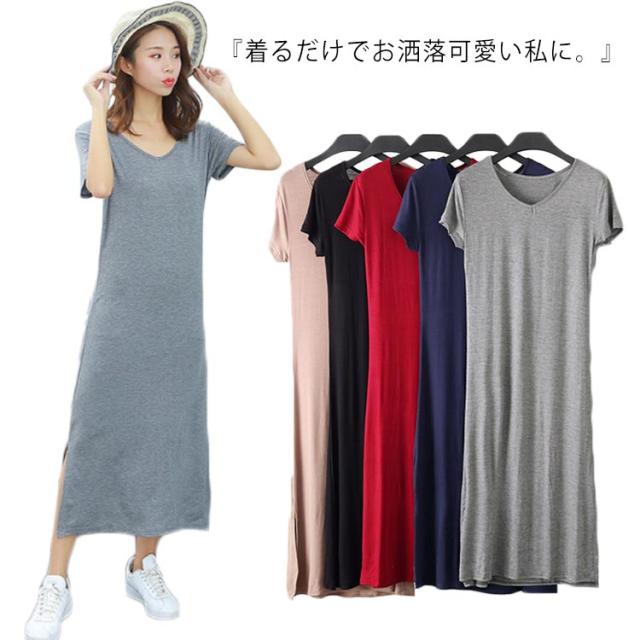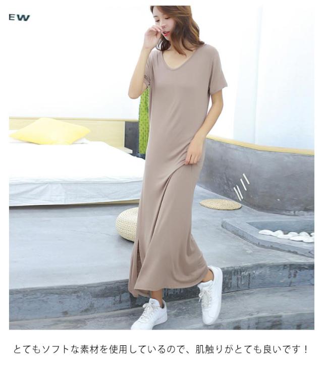 ルームウェア パジャマ ワンピース tシャツワンピース 半袖 ロングカットソー Vネック レディース 夏 ロング丈 無地 ゆったり 柔らか スリット 大きいサイズ 体型カバー きれいめ おしゃれ 部屋着 シンプル 薄手 春夏