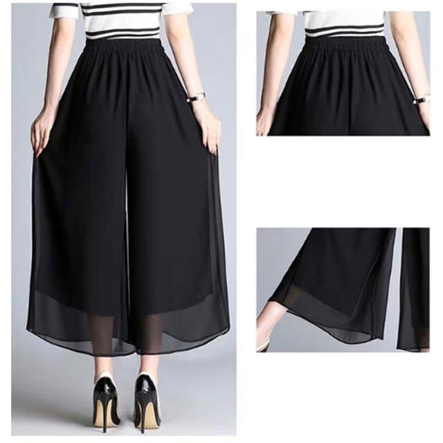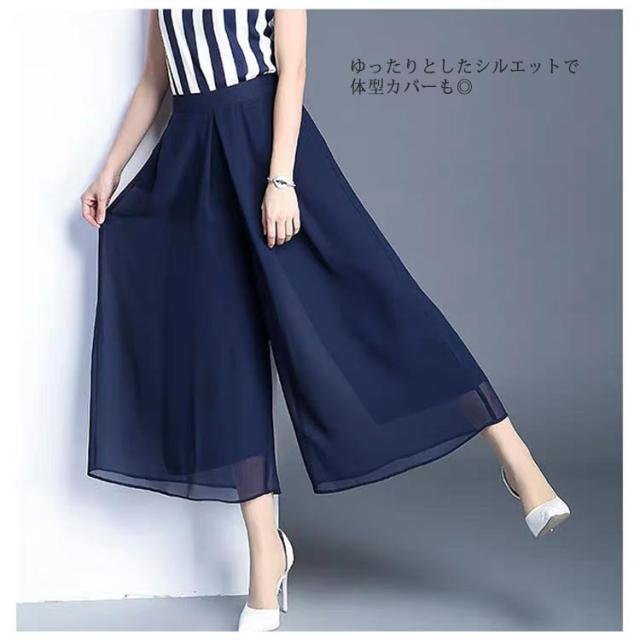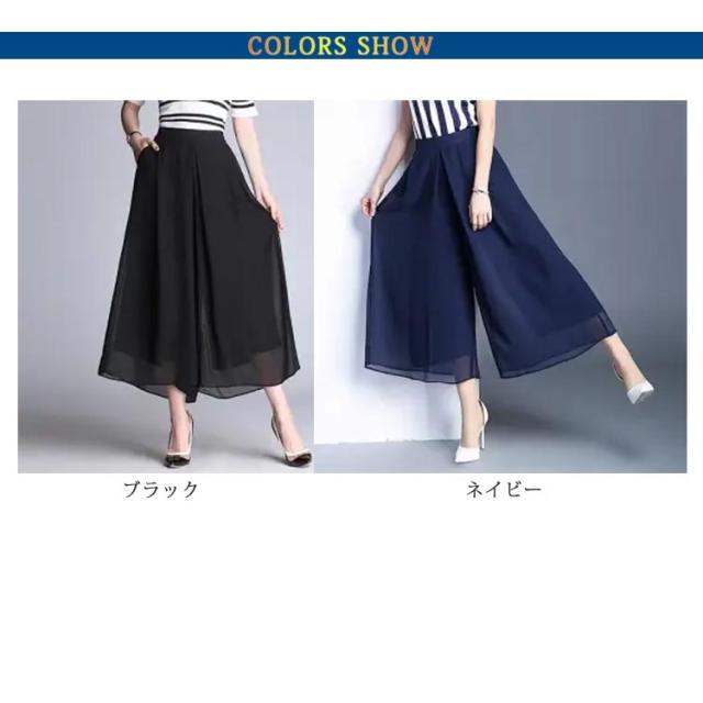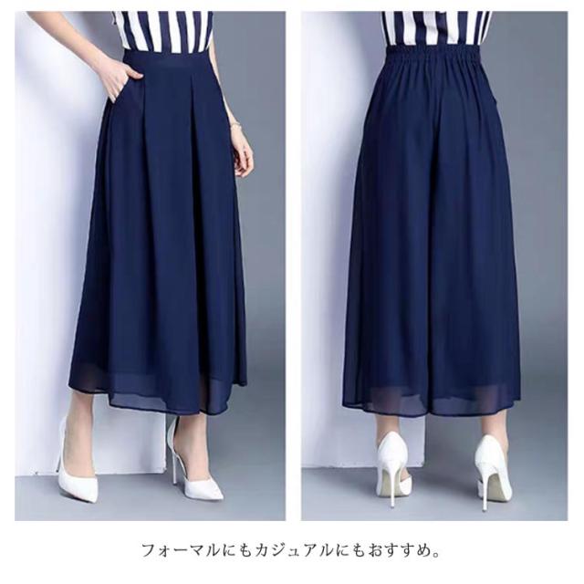 | シフォンスカートのようなワイドパンツ。 ゆったりとしたシルエットで体型カバーも◎ フォーマルにもカジュアルにもおすすめ。 ウエストはゴム仕様で楽ちん。 | |