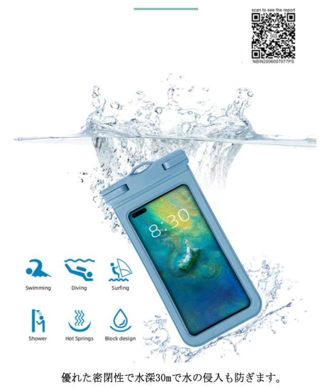 | 水深30mにも完全防水!スマホ防水ケース 優れた密閉性で水深30mで水の侵入も防ぎます。 顔認証対応し、ケースを付いたままでノックに解除も簡単に行えます。 0.3mm薄手で高透明感素材を採用し、変形しにくく水中にも綺麗に撮影できます。 雨日、ビーチ、温泉など場合ではスマホを防水カバーに収納したままで写真や撮影を気楽に遊んで楽しめます。 | |