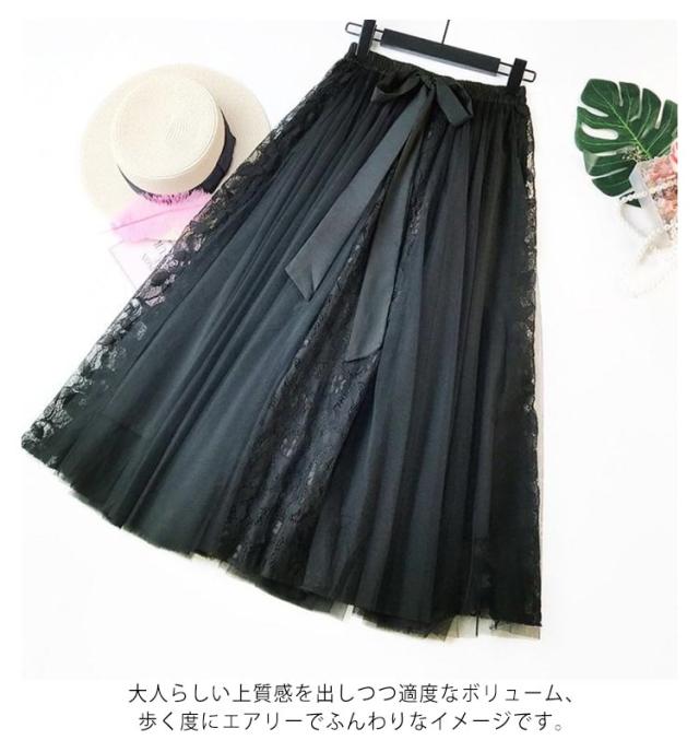 レース切り替え スカート ロング レース チュールスカート ロングスカート フレアスカート リボン ミモレ丈 スカート 裏地付き ボリューム トレンド ゆったり かわいい 動きやすい 春夏 S M L XL 2XL 送料無料