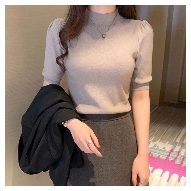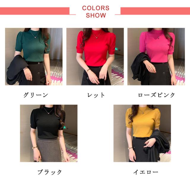 ニット レディース タートルネック ハイネック パフ袖 半袖 大人きれい シンプル デイリー オフィス カラーバリエーション サマーニット 大人かわいい服 大人可愛い ママ 着痩せ 体型カバー