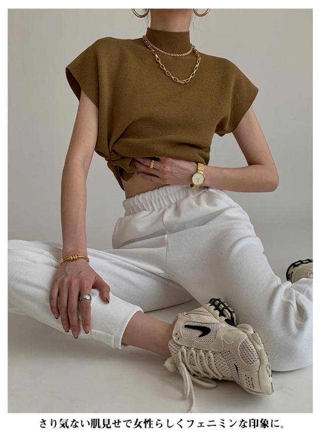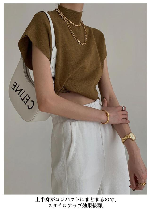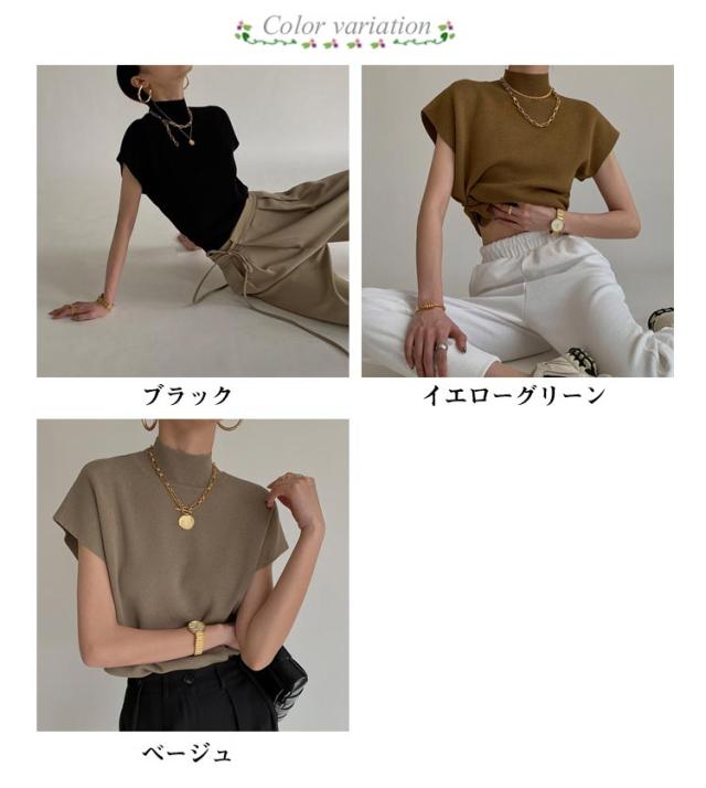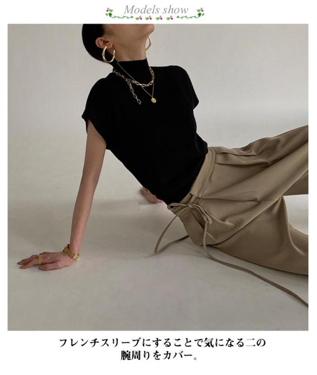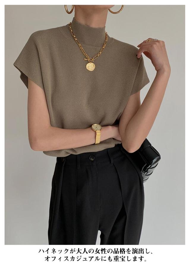サマーニットトップス モックネック フレンチスリーブ リブニット レディース トップス サマーニット 半袖 フレンチ袖 ニットソー ハイネック 春 夏 きれいめ スーツ セーター オフィスカジュアル 上品 大人 シンプル 送料無料