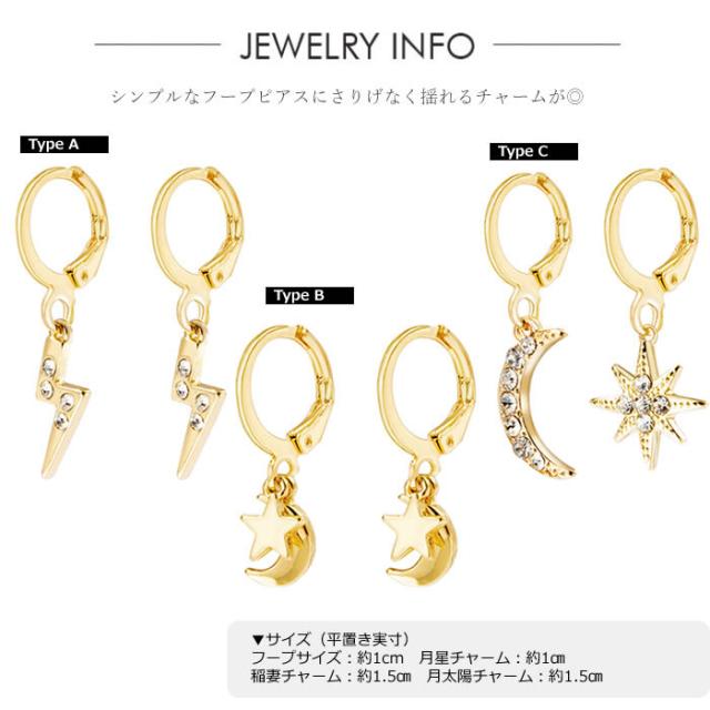月と星、稲妻、月と太陽などのかわいいフープピアスです。小さなラインストーンが装飾されていたり、アシンメトリーデザインだったりとちょっとしたアクセントになります。揺れて目を引くおしゃれなピアスです。▼サイズ(平置き実寸)フープサイズ:約1cm月星チャーム:約1cm稲妻チャーム:約1.5cm月太陽チャーム:約1.5cm【ご使用上の注意】※モニターにより色の見え方が実際の商品と異なる場合がございます。※就寝時、スポーツ時、衣類の脱着時、サウナや冷所でのご使用はおやめ下さい。破損や火傷、凍傷の原因になります