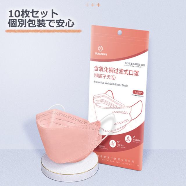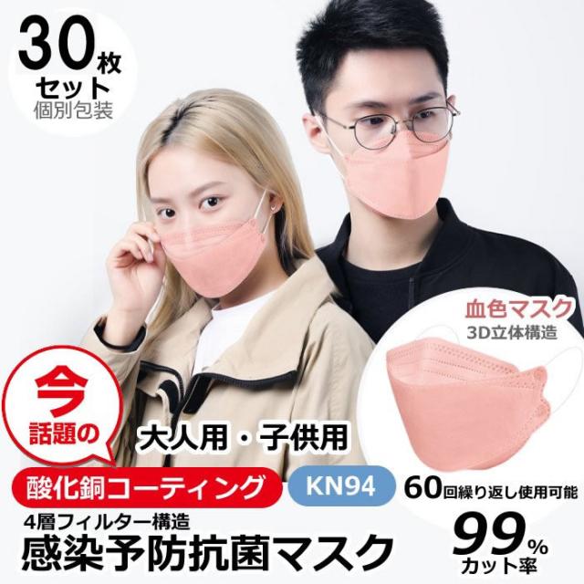 【30枚セット】酸化銅マスク 抗菌マスク 大人 子供 KF94 マスク 血色カラー 高性能 フィルター 個別包装 不織布 立体型 4層構造 男女兼用 快適