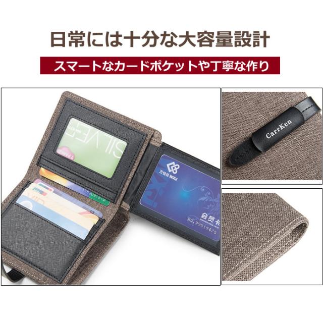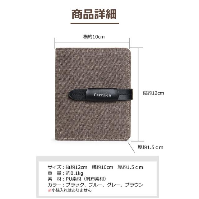 サイズ:縦約12cm 横約10cm 厚約1.5cm重 量:約0.1kg素 材:PU素材(帆布素材)カラー:ブラック、ブルー、グレー、ブラウン※小銭入れはありません耐久性や機能性を持った素材を慎重に選び丁寧に仕上げ流行に左右されないデザインで人気な紳士財布です。ご自身用はもちろん、ギフトとしても喜ばれることに間違いなし!シンプルなデザインで、余計な装飾は一切省き、使い勝手の良さと飽きの来ないデザインです。帆布素材なので耐久性にすぐれ傷になりやすく丈夫で手触りがよいお財布となっています。※小銭入れはありません