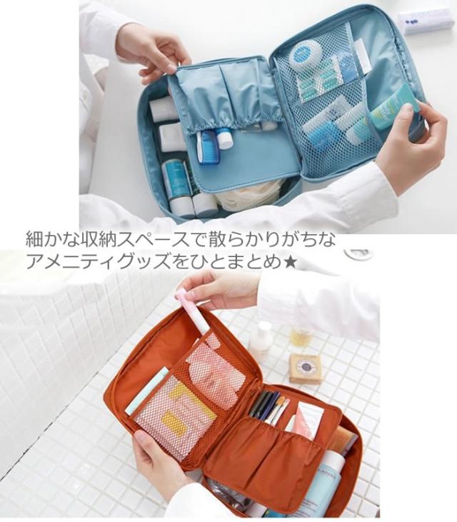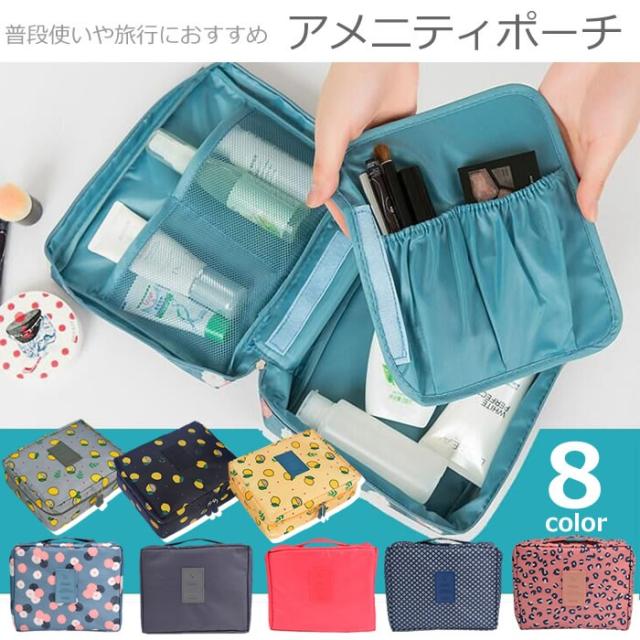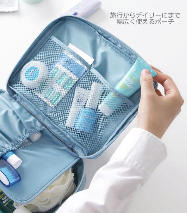 ●トラベルポーチ おむつポーチ 化粧ポーチ アメニティポーチ メイクポーチ バッグインバッグ 旅行ポーチ 多機能ポーチ 送料無料出張、旅行の時や普段使いにもお使いいただけるポーチです。コスメや洗面具など細々したアイテムを一つのポーチにまとめる人気可愛いポーチです。シンプルなデザインだけど内部は機能性抜群です。コンパクトサイズながらも見た目以上のたっぷり収納、ラウンドファスナーだから見開きで荷物の在り処が一目瞭然!歯ブラシ、化粧品、ブラシ、シェーバーなどの小物を入れることができます。メッシュポケットなので、洗面具などの小物を綺麗にすきっり、また取り入れしやすく収納してくれます。中ポケットは取り外し可能、収納する物に応じて付けたり外したり自由自在持ち手付きなので旅先での持ち運びも簡単楽々、撥水加工生地だから若干の水濡れも大丈夫♪吊り下げ用のフックを付属しているので、壁掛けが可能。持ち手がついてるので外出時持ち運びにも便利です☆サイズ:ヨコ21cm×マチ8cm×タテ18cm 重さ約90g素 材:ポリエステル 防水表面