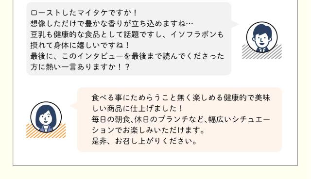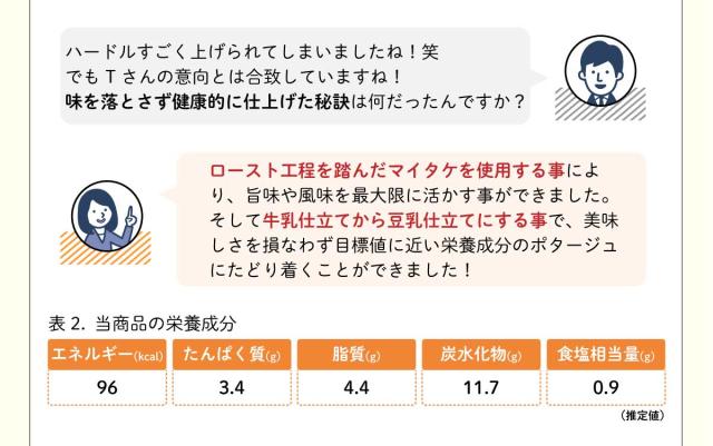 ■原材料名:マイタケ、豆乳、ソテーオニオン(たまねぎ、植物油脂)、チキンブイヨン、乳等を主要原料とする食品、砂糖、野菜エキスパウダー、全粉乳、粉末植物油脂、バター、ゼラチン、酵母エキス、食塩、コンソメバウダー、ベース調味料、香辛料//増粘剤(加工デンプン、キサンタンガム)、トレハロース、( 一部に小麦・乳成分・ 大 豆 ・鶏肉・豚肉・ゼラチンを含む)