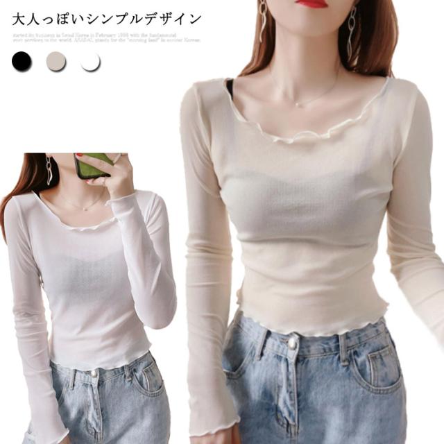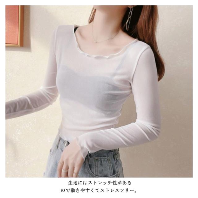 シアートップス シースルー 無地 インナー レディース ランドネック トップス 春 長袖 UV対策 シースルー トップス チュールレース レイヤード インナー 薄手 きれいめ ラウンド シアー